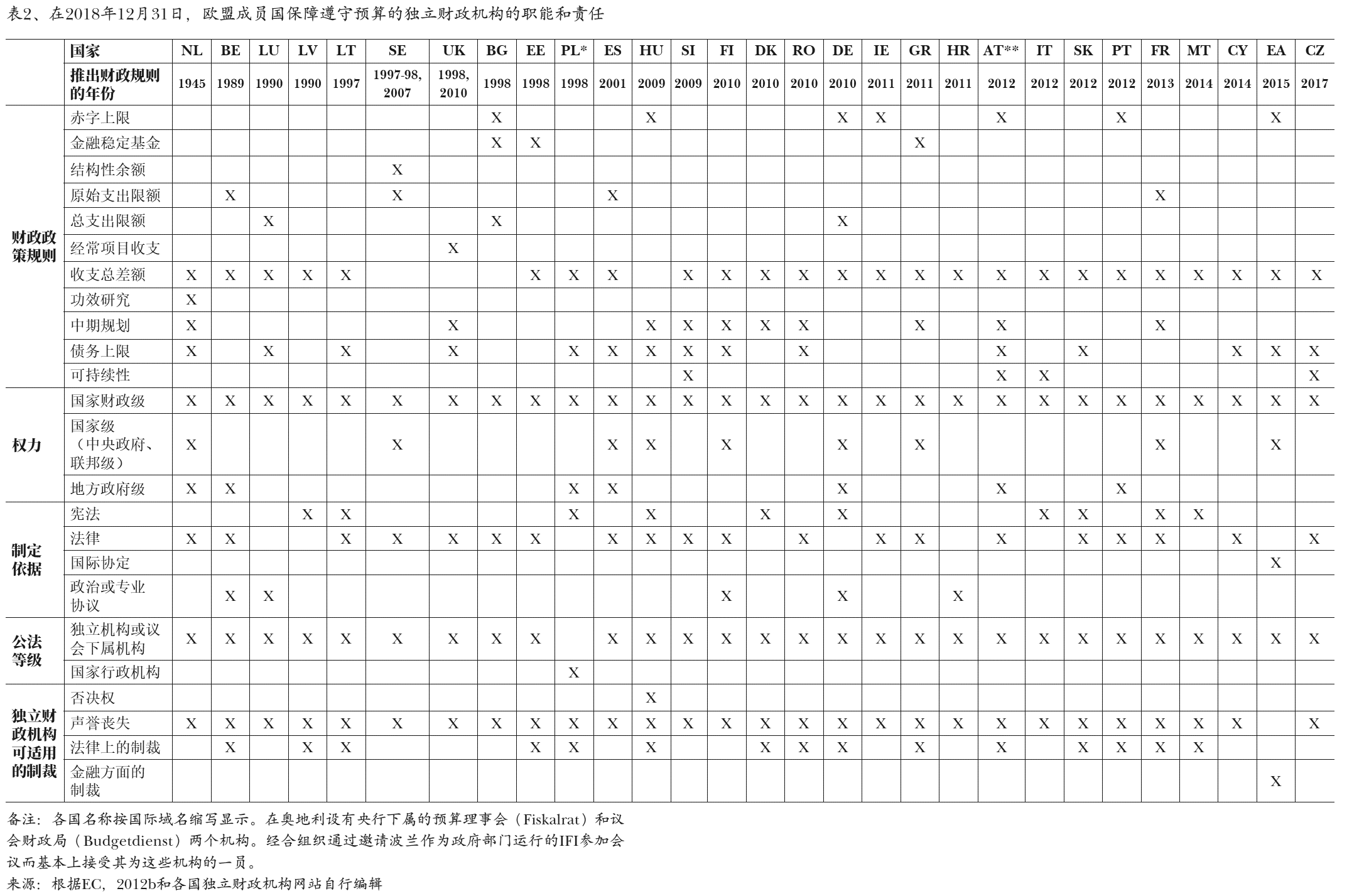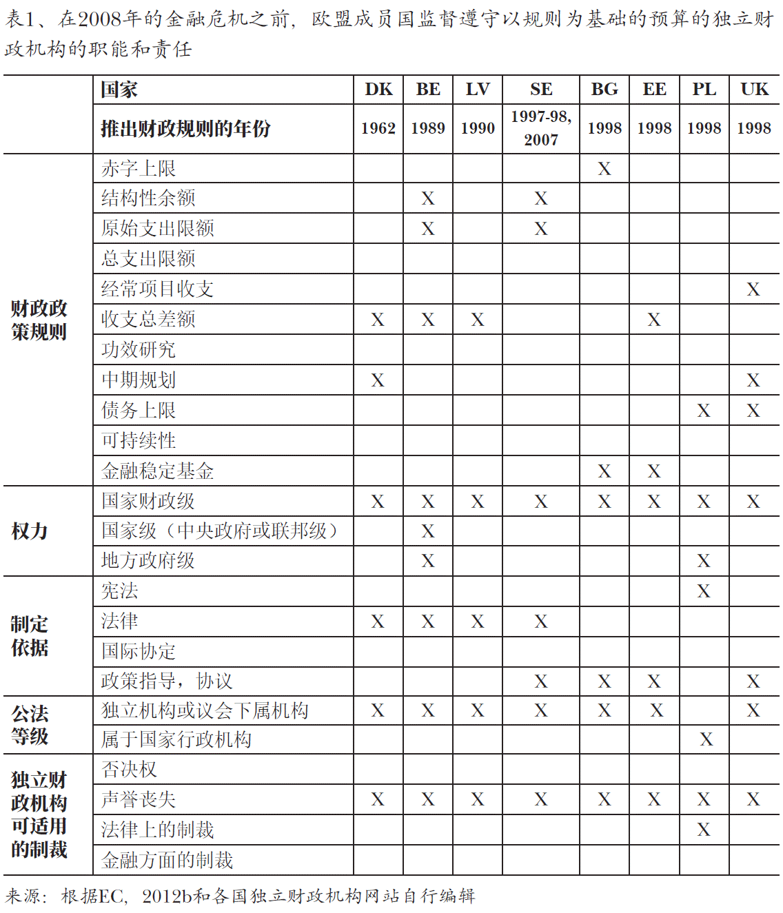 至于监督遵守规则的机构等级,要独立于政府是个普遍的要求。波兰与众不 同,因为该机构是作为行政权力的一部分,在危机之前十年建立的。5表2、显 示,归因于一体化进程和施行以规则为基础的预算的国家处理危机的成功案例, 在2008年危机后,欧盟越来越多的新成员国开始应用这种预算规则和制度保障(Kovács Á., 2013)。6