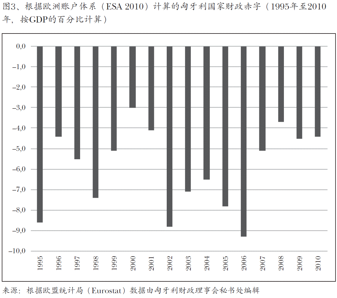 显而易见,实现金融政策所追求的目标,不仅取决于制定适当的规则,又取 决于纪律严明地遵行和使人执行。而在这方面,认为元素、社会识别利益的能力 和意志力都发挥着重要作用。没有这些因素的支持,国家的金融稳定就难以实现 (Kovács,2016)。匈牙利政变后的各个政府的金融政策均以谈判机制、基于 政治承诺和信条的计划和管理为特征。这为国家财政稳定和可持续发展带来了 障碍(Antal,2004; Karsai,2006; Lentner, 2008; Matolcsy,2008; Muraközy,2010)。匈牙利国家财政赤字不时(主要是接近选举年份时)“飙升”: 2002年和2006年,接近于国内生产总值的10% (图3、)。14