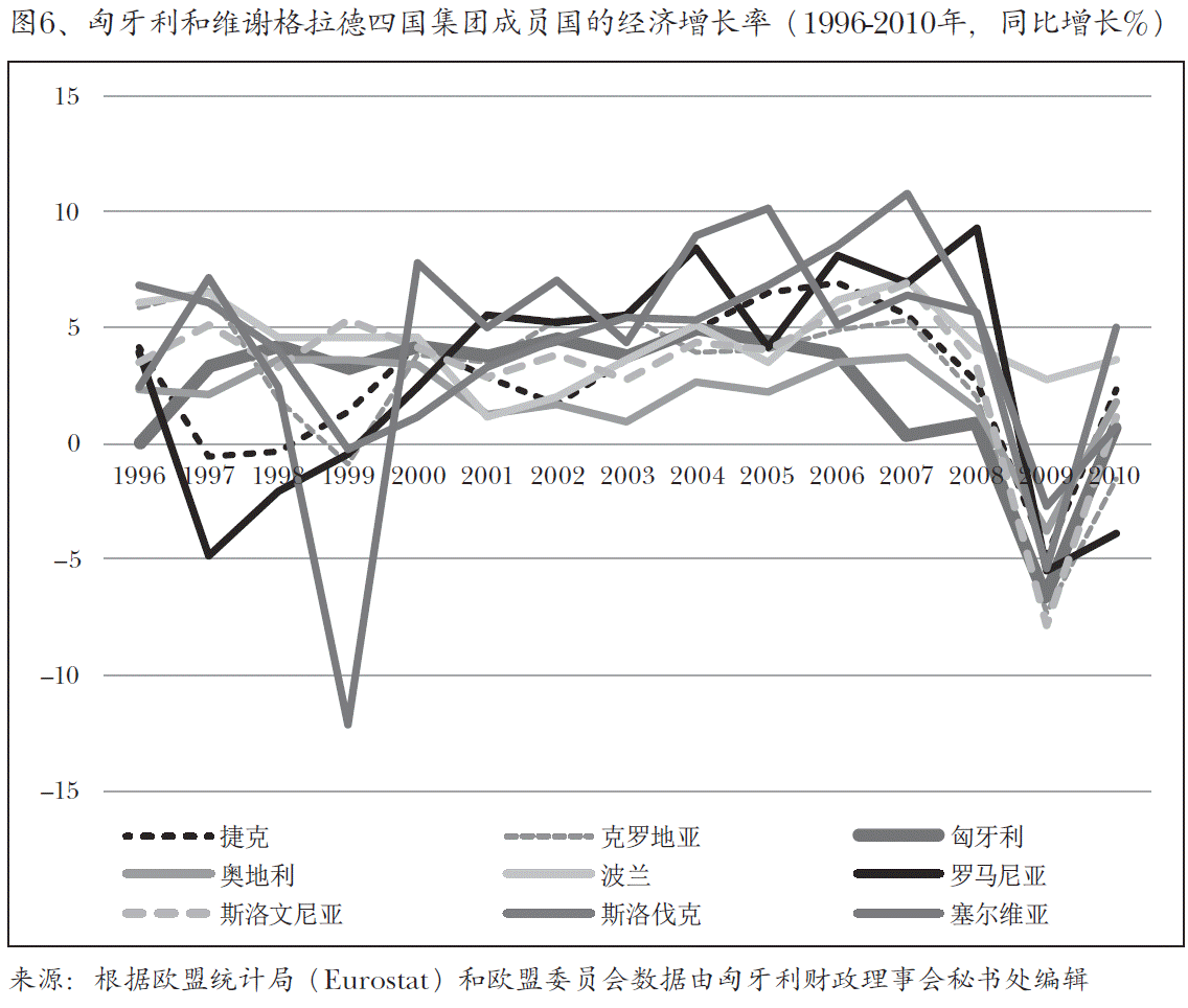 上述原因(以及诸多元素,如越来越低的生产率)导致匈牙利与邻国相比经 济增长较为温和,甚至下降,而且只有通过引进外部资金(增加外债)才能维 持增长(图6、)。