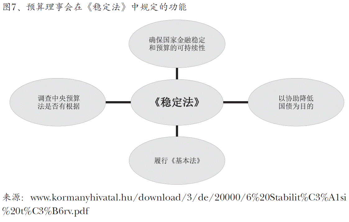 《基本法》还将负责遵行预算稳定规则的预算理事会(简称理事会,匈文简 称为KT)确定为宪法规定的运作条件。该理事会是支持国会立法工作的机构, 从属于《基本法》和各项法律执行其功能。其中一方面协助起草中央预算法案、 作为支持机构研究国会的立法活动,对中央预算的依据提出意见而且为了遵守 外债规则而事先同意(或不同意)通过关于中央预算的法案。理事会作为独立财政 机构,以该功能在可起草财政法案的过程中获得了公法功能,即所谓的否决权”, 当然也承担了相应的责任。