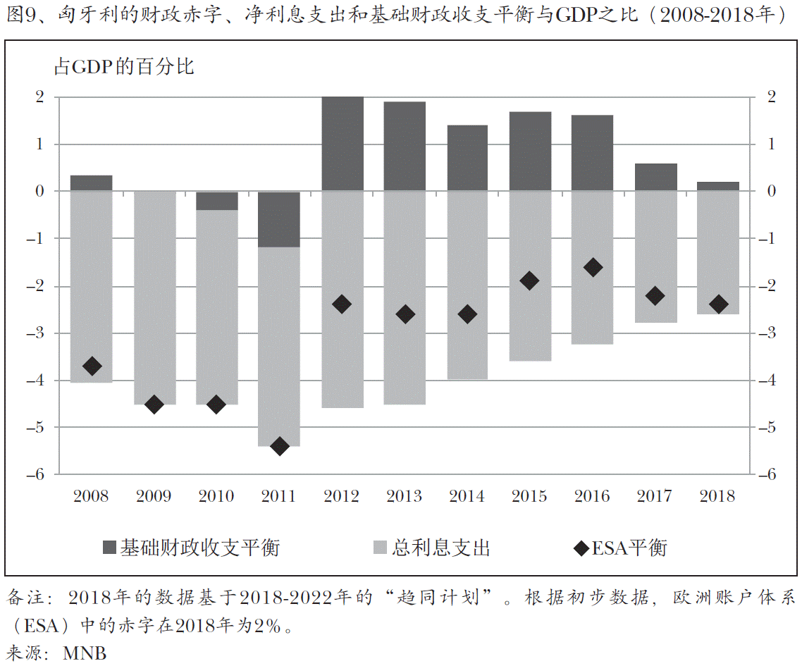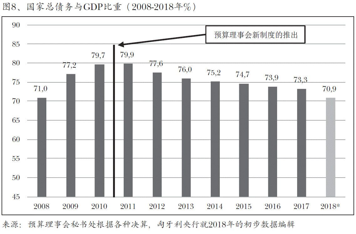 随着基于规则的预算要素的应用和预算理事会的活动(通过《基本法》和 《稳定法》加强对其的标准,得益于使其更加透明和一致),在2011年后国家 财政的平衡无论是在赤字还是在债务指标方面都有明显改善。预算稳定使公共财政能越来越多地(如今以2010年代的两倍)促进经济发展。但是,竞争力指标27 仍然落后于类似维谢格拉德国家的指标。与此同时,匈牙利财政仍存在那些与匈 牙利财政运行效率低,缺乏金融稳定相关的弱点,缺乏从经济运行中提取资源, 致使在2004年至2010年竞争力大幅度下降的决定性原因。