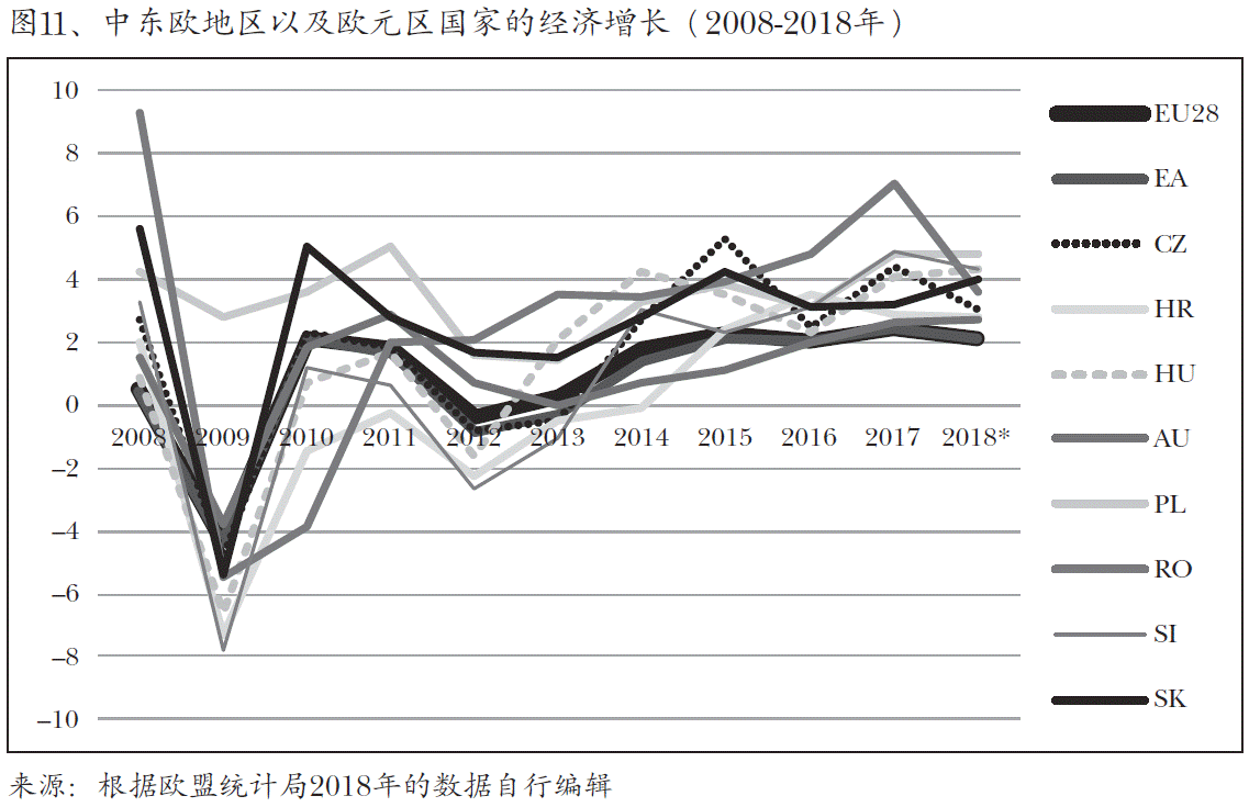 在匈牙利,自2013年以来一直有着决定财政稳定性的经济增长。应该强调的 是,2014年和2015年是自90年代初以来的头两年,匈牙利经济能够增长,但是国 债和经济外债都没有增长。经济景气加强,区域经济增长超过欧元区平均水平是 有利的(图11、)。关于这一图应该指出的是,2018年匈牙利经济的扩大远远超 出了欧洲委员会最后(2018年秋季)的预测,达到了为4.9-5%(EC,2018)。