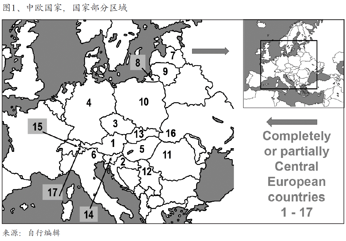 中欧国家为,这些国家不仅国土一部分位于中欧(请查看第1号图):捷克、 波兰、斯洛伐克和匈牙利(V4国)、立陶宛和拉脱维亚。奥地利和德国也是中 欧部分,德语地区的经济是全球玩家以及经济扩张方面也是输出国-在通过历史 可以理解他也为获得东欧经济主权也类似英美与俄罗斯竞争,而不是一个适合作 为门的国家。