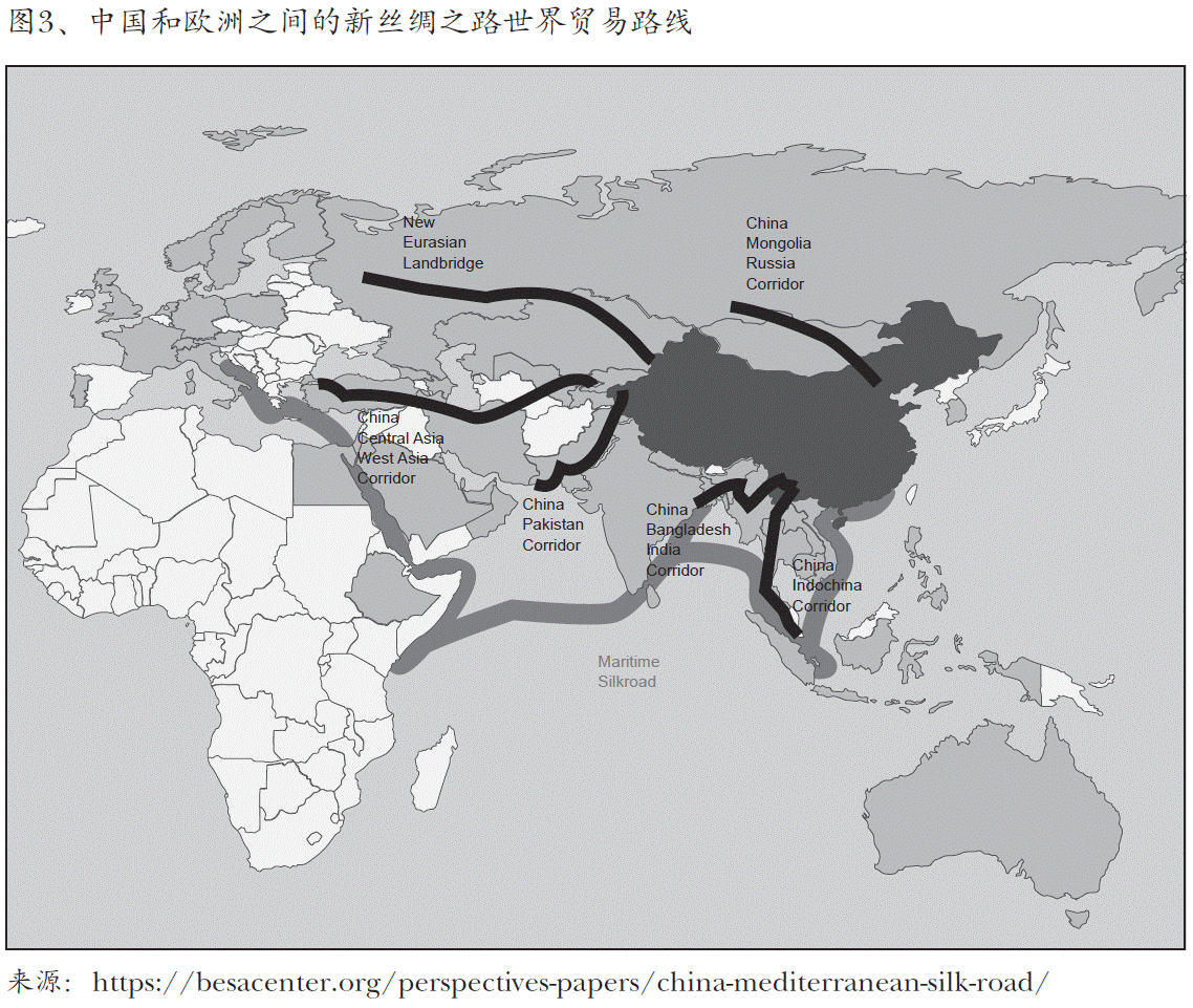 “一带一路”项目复苏古丝绸之路概念,促进中国与其他国家之间经济,生产, 贸易合作及欧亚之间运输国际化协调。此项的实现就在心脏地带区域。新丝绸之 路地缘政治策划中无论是横穿俄罗斯的北部路线,还是从高加索区域往南的南部 线路,或是穿过马六甲海峡、亚丁湾和苏伊士运河的海上路线都是通过中欧而到 达欧盟地区。陆地路线通过铁路和公路投资而改善基础设施,海上路线则为世界 最最繁忙的货运区域。所有的路线都需要通过中欧而到达欧盟:因此中欧成为了 欧洲之门(图3、)。