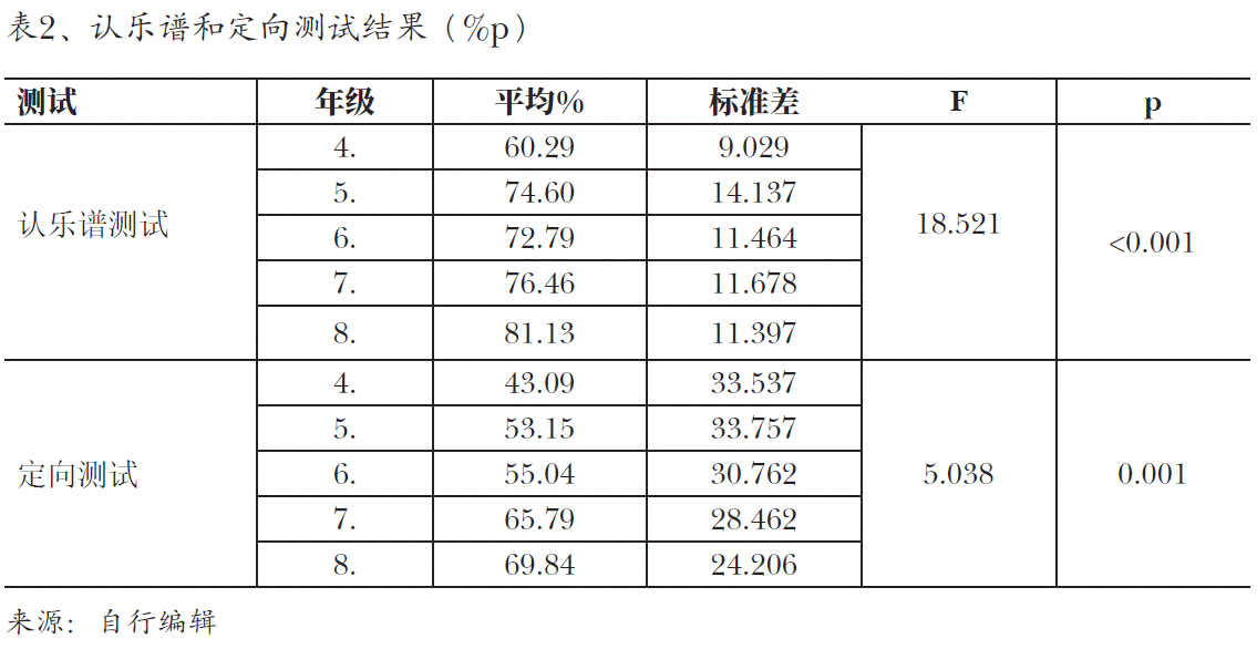 该测试符合各年级的发展水平。9-14岁儿童在认乐谱测试中的平均表现为 73%,标准差为12.35。在连续年级间我们没有发现显著差异,然而,完整测 试中的四年级,六年级和八年级的成绩差别很大,因此,阅读音乐的能力每隔 两年继续发展。在测量定向技巧的情况下,我们没有发现各年级之间的显著差 异。57.91 %的学生能够正确解决有关定向的任务(表2、)。